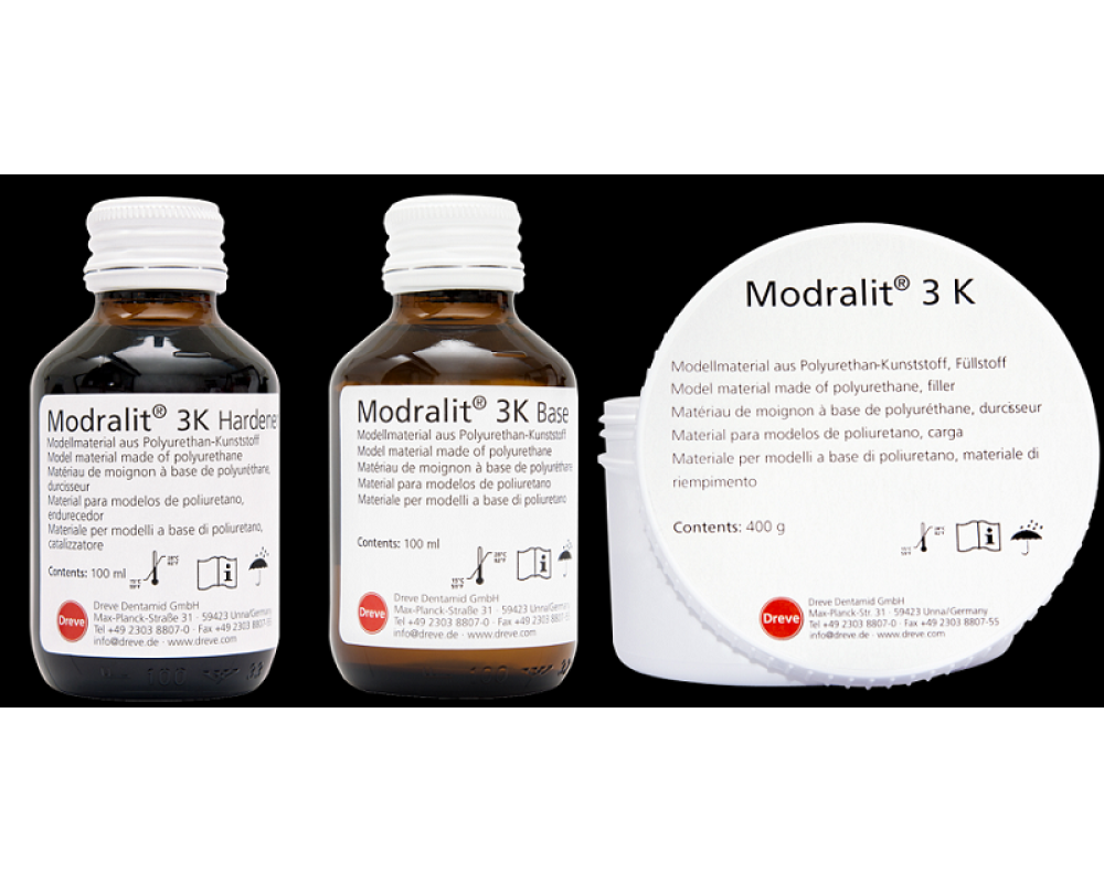 Material turnabil pentru model, pe baza de poliuretan pentru producerea modelelor de precizie. Datorita rezistentei la margini, Modralit 3K este foarte potrivit pentru tehnologia EM si NEM si este deosebit de potrivit pentru prepararea coroanelor partiale. Setul este suficient pentru aproximativ 10 danturi complete, care pot fi acoperite cu vopsele comerciale.