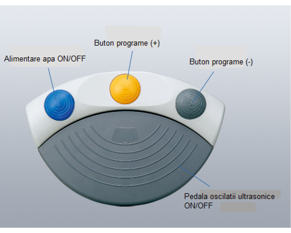 Pedala de control: alimentare apa ON/OFF, programe (+), programe (-), pedala oscilatii ultrasonice ON/OFF.