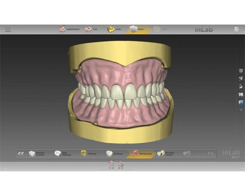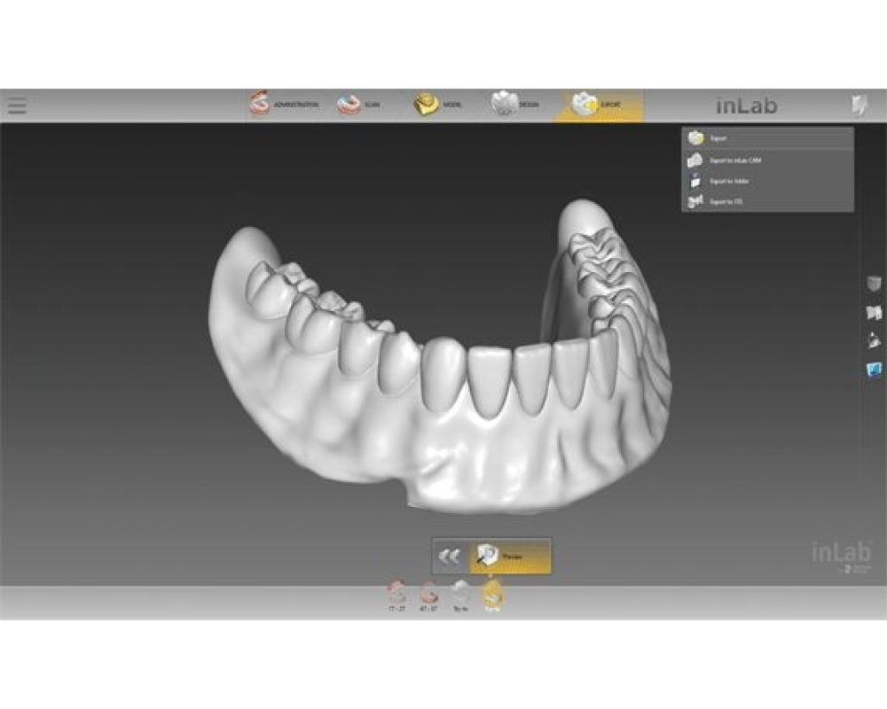 Baza protezei (si Try-in monolitic) poate fi strunjita dintr-un disc sau produsa prin imprimare 3D. Datele de proiectare sunt transferate fara probleme in cadrul sistemului inLab catre software-ul CAM inLab sau sunt exportate alternativ ca format STL prin modelul de interfata optional al software-ului CAD in Lab.