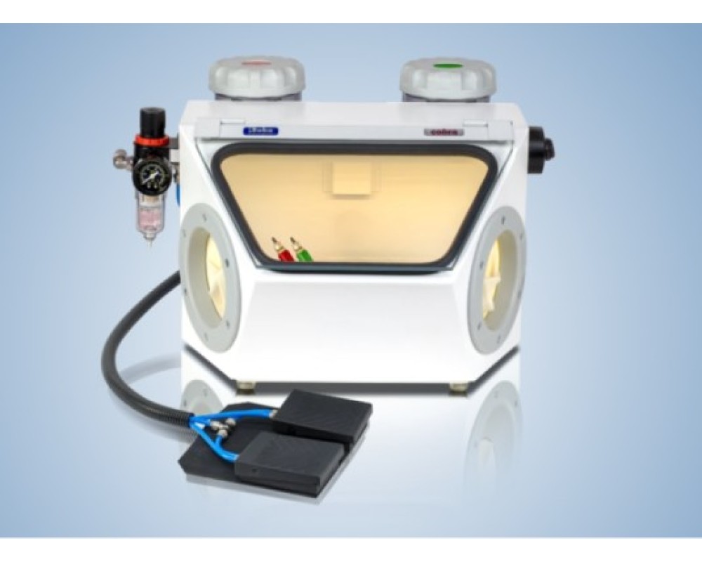 Forma ascutita a boabelor de nisip de alumina si presiunea asupra materialului curatat reprezinta un risc pentru mana utilizatorului in timpul detinerii unui detaliu sablat. Cobra este echipat cu manusi rezistente la jetul puternic de nisip care protejeaza mainile tehnicianului dentar.