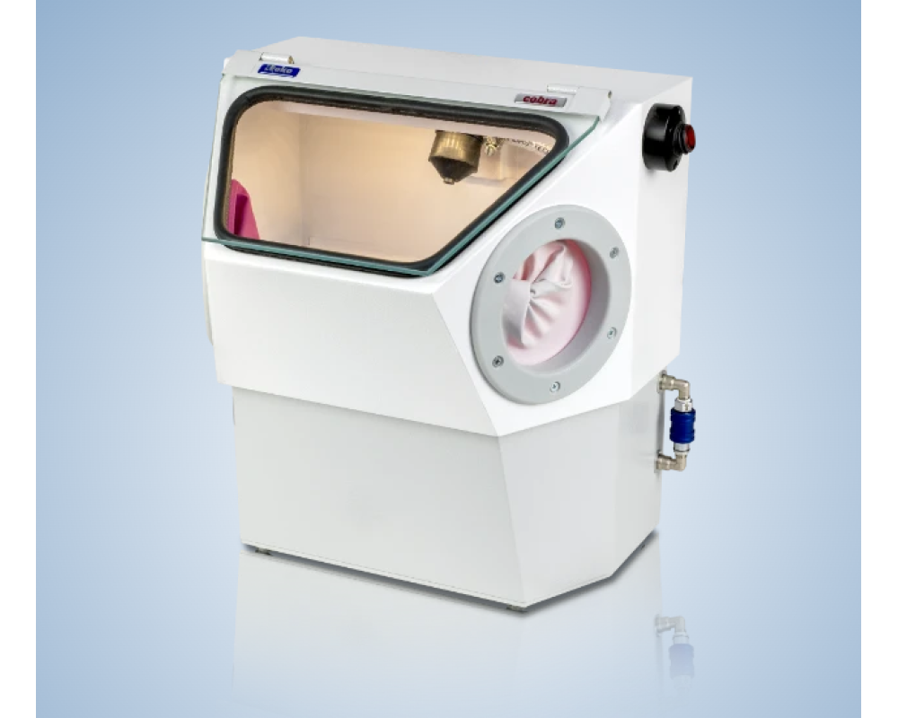 Cobra S este un sablator stationar pentru tratarea reziduurilor de lucru turnate din metal ale masei tamponului. Proiectarea modulului de duza, sablatorul are o admisie mica de aer si un lucru eficient de la 4 atm.